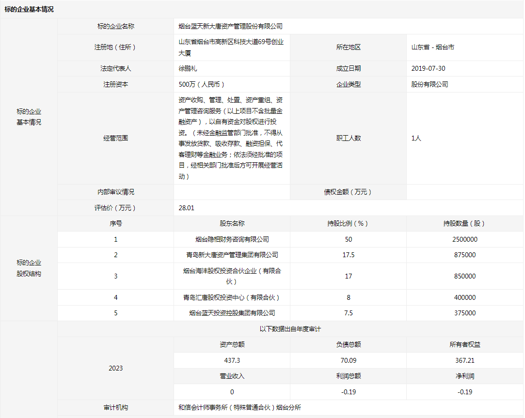 煙臺藍天新大唐資產(chǎn)管理股份有限公司7.5%股權(quán)(37.5萬股股份)