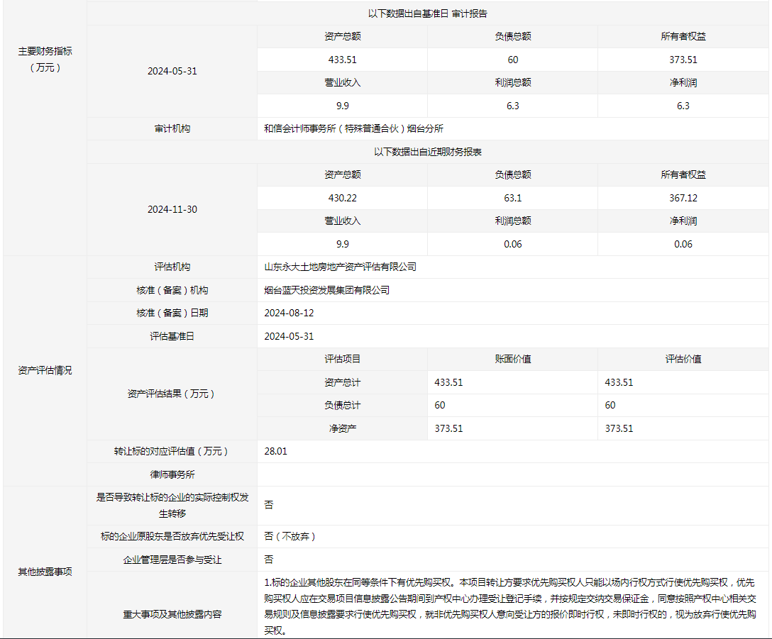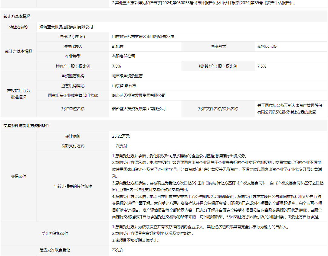 • 轉(zhuǎn)讓方:煙臺藍天投資控股集團有限公司