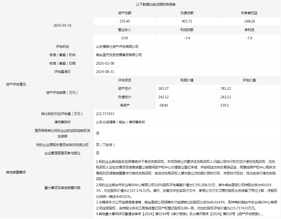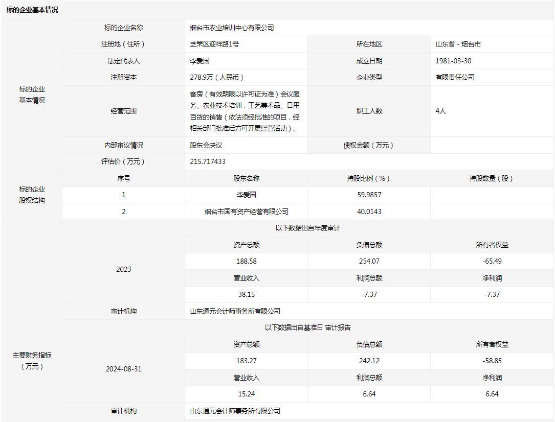 煙臺市農業(yè)培訓中心有限公司40.0143%國有股權