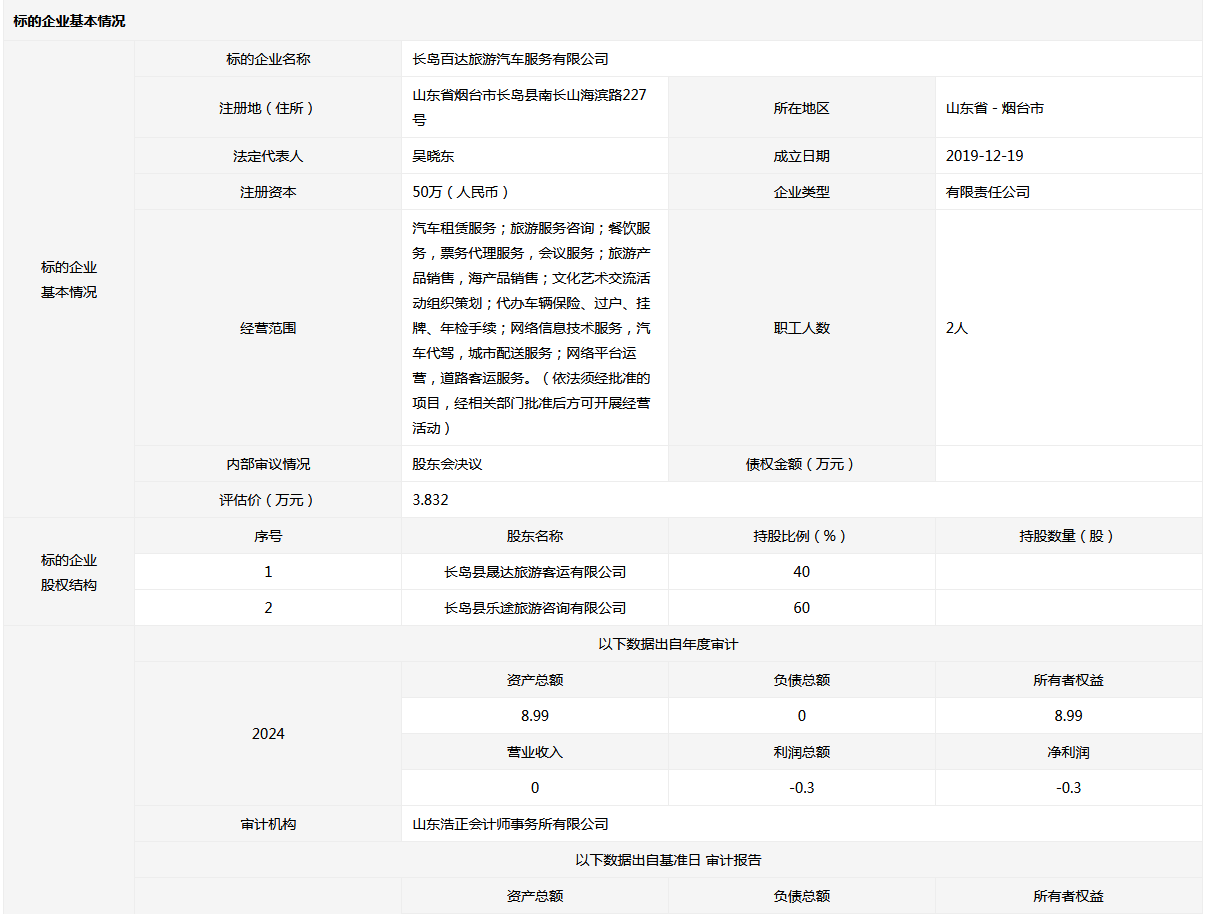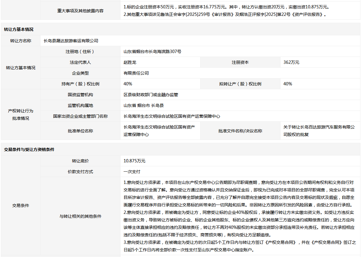 長島百達旅游汽車服務(wù)有限公司40%國有股權(quán)