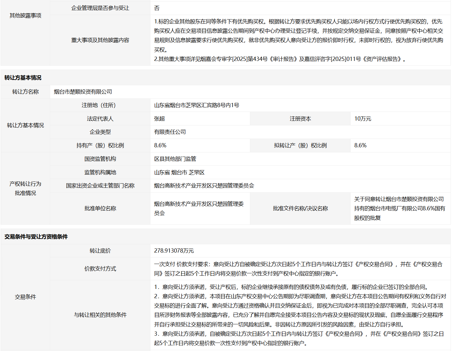 轉(zhuǎn)讓方:煙臺市楚順投資有限公司