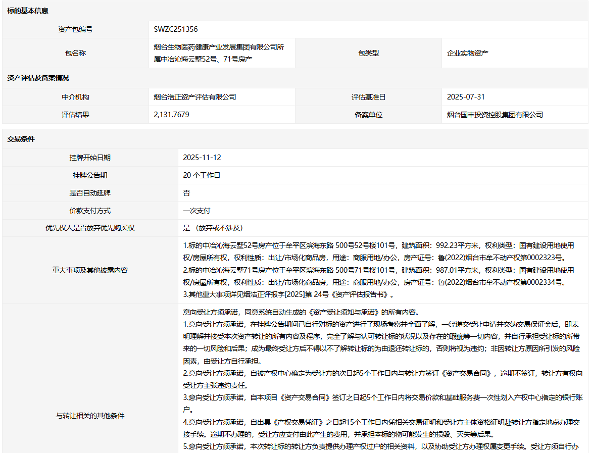 煙臺生物醫(yī)藥健康產(chǎn)業(yè)發(fā)展集團(tuán)有限公司所屬中冶沁海云墅52號、71號房產(chǎn)