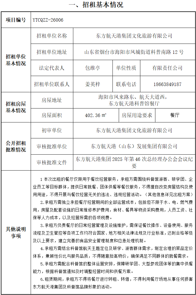 東方航天港科普館餐廳租賃運營服務(wù)項目